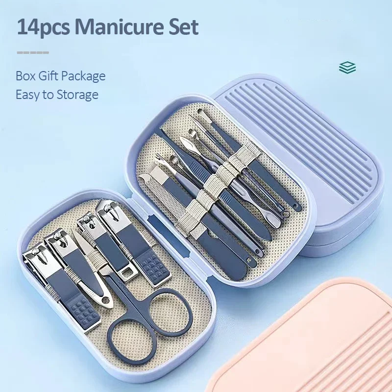 14-teiliges Deluxe-Maniküre- und Pediküre-Set, rosa und blaue Nagelschere aus Edelstahl, Haarschneidemaschine, Ohrgrabenlöffel für Männer und Frauen