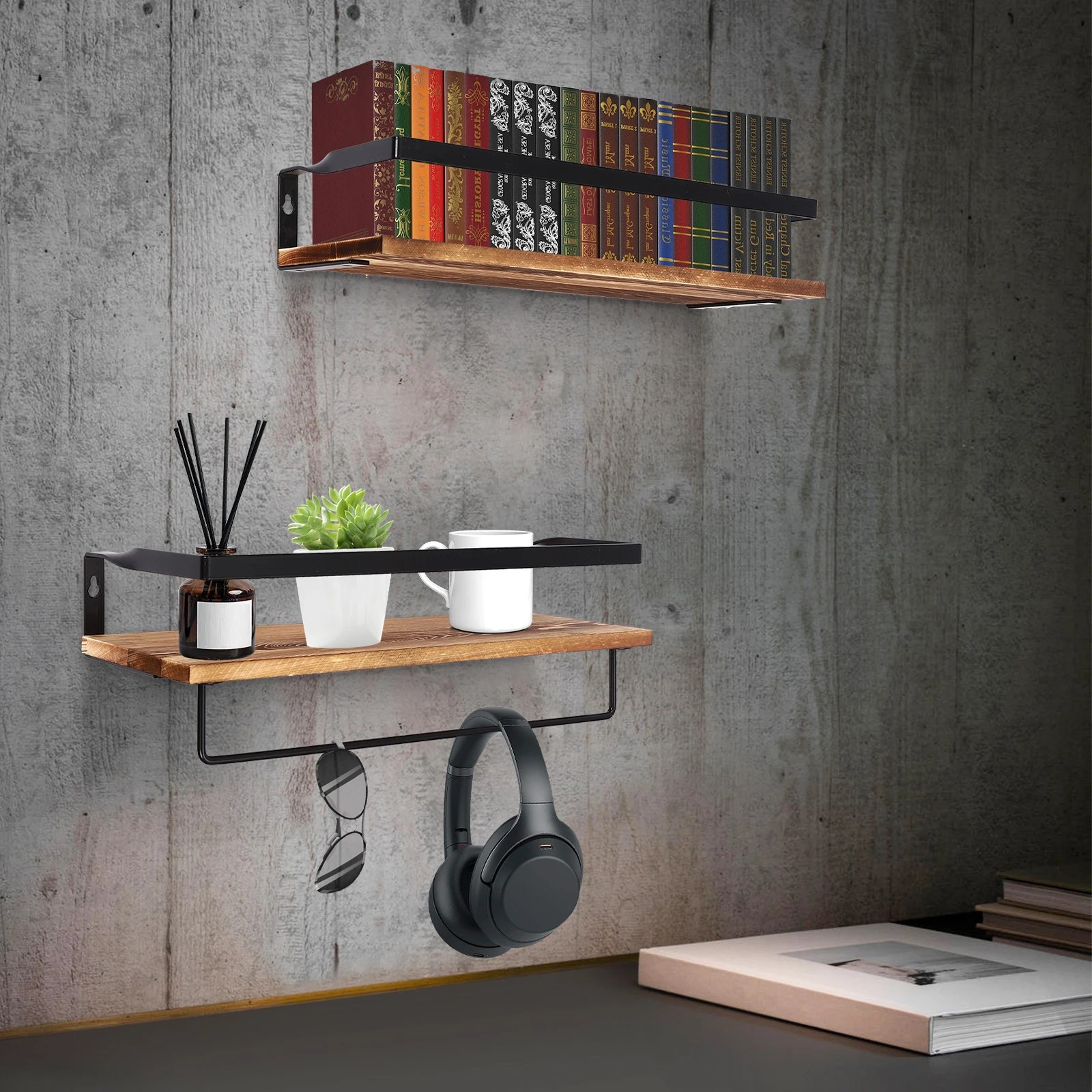 The wooden wall-mounted shelves with high-quality pine wood are present in natural wood charcoal color, showing you the warmth and comforts of nature. The open storage space not only allows for easy access to your items but also gives the home environment an artistic aesthetic. It makes great use of space without occupying the floor space. Whether you put books, green plants, photos, and other items, you can make it a bright landscape in your home so that you can enjoy a quiet and comfortable quality of life.