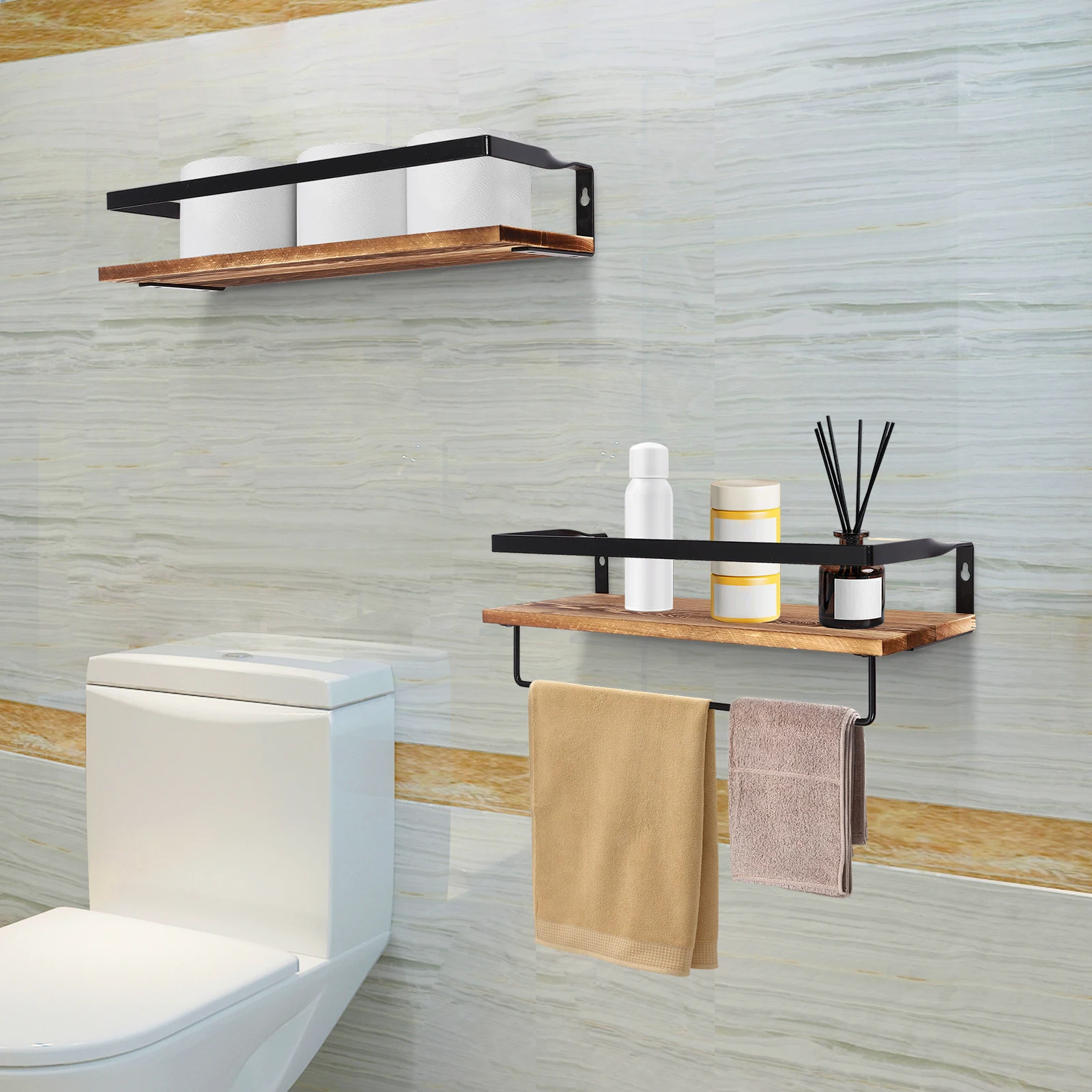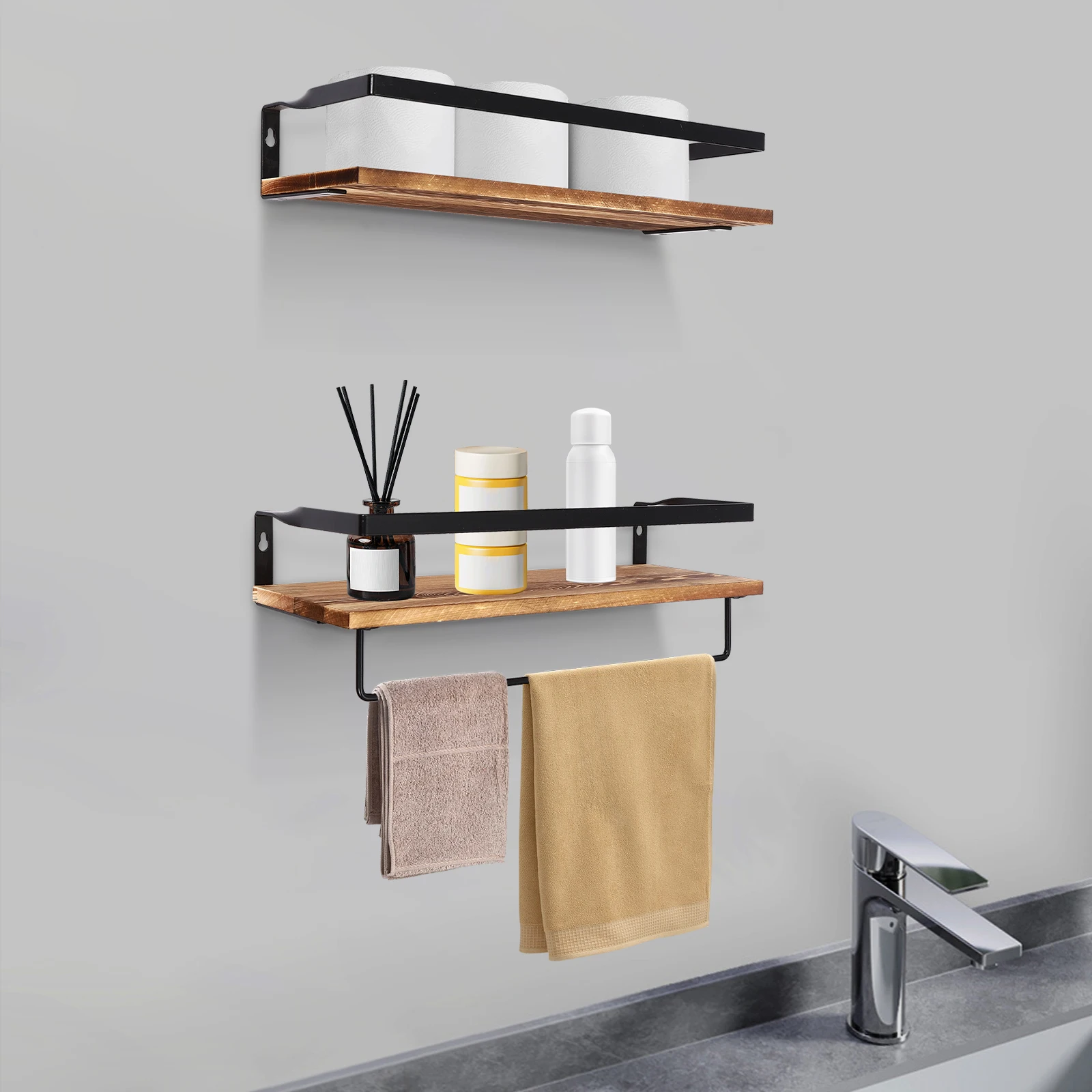 Thoughtful Design: The product with a 2-tier design provides you with a proper storage place, and a towel rod can hang your towels, headphones, glasses, keys, etc., making your room more organized, neat, and clean.