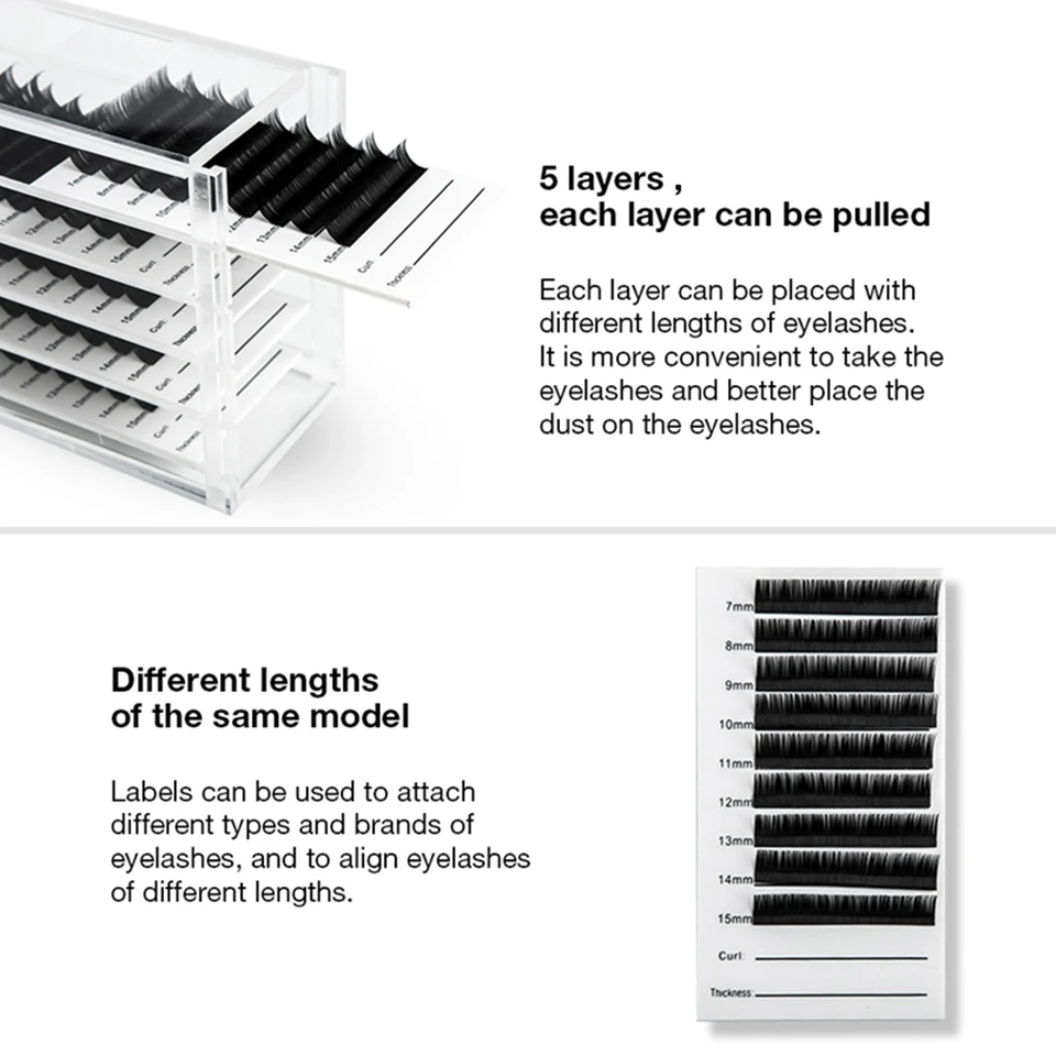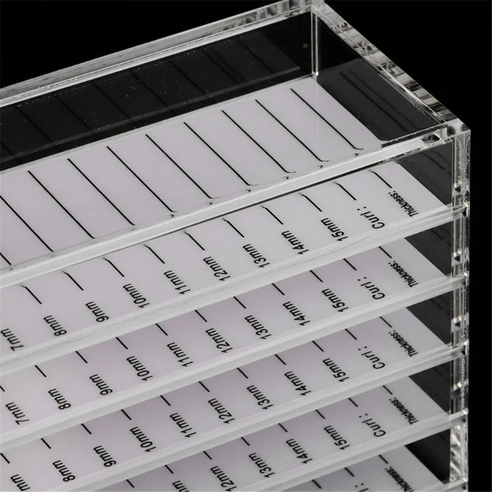 Vorteile: hochwertiges Material, schöner; kleine Form, bequemer zu platzieren; geschichtete Markierung, die hilft, die Länge der Wimpern zu unterscheiden.